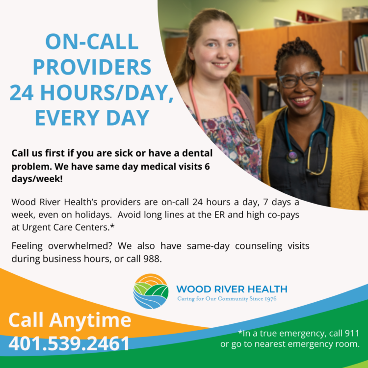 Wood River Health’s providers are on-call 24 hours a day, 7 days a week, even on holidays. Avoid long lines at the ER and high co-pays at Urgent Care Centers. Contact us anytime at 401.539.2461. In a true emergency, always call 911 or go the nearest emergency room.