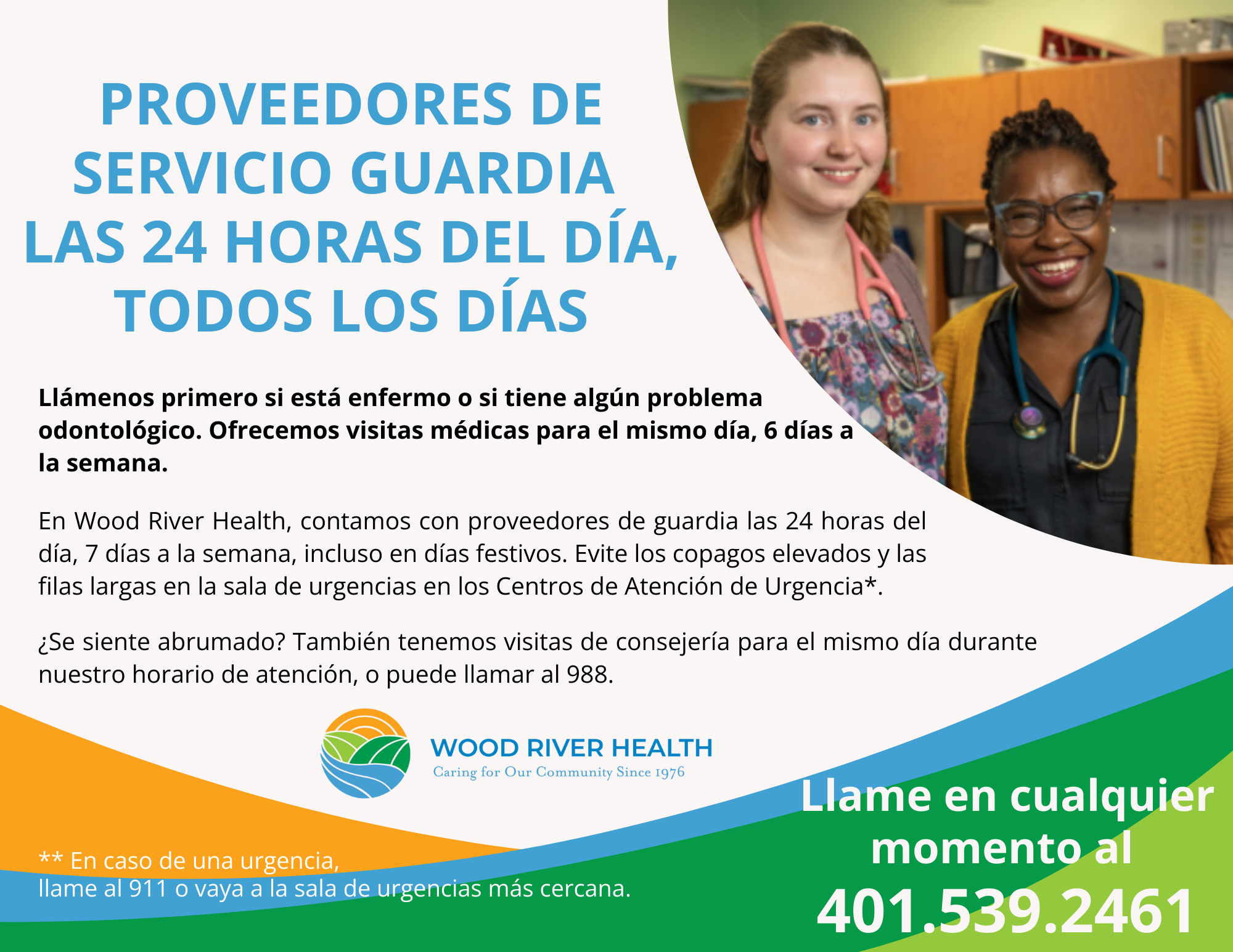 Los proveedores médicos de Wood River Health están de guardia para ayudarlo cuando esté enfermo, las 24 horas del día, los 7 días de la semana, los días festivos y los fines de semana. Llame al 401.539.2461.