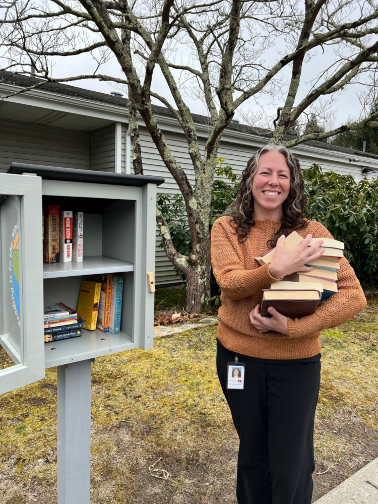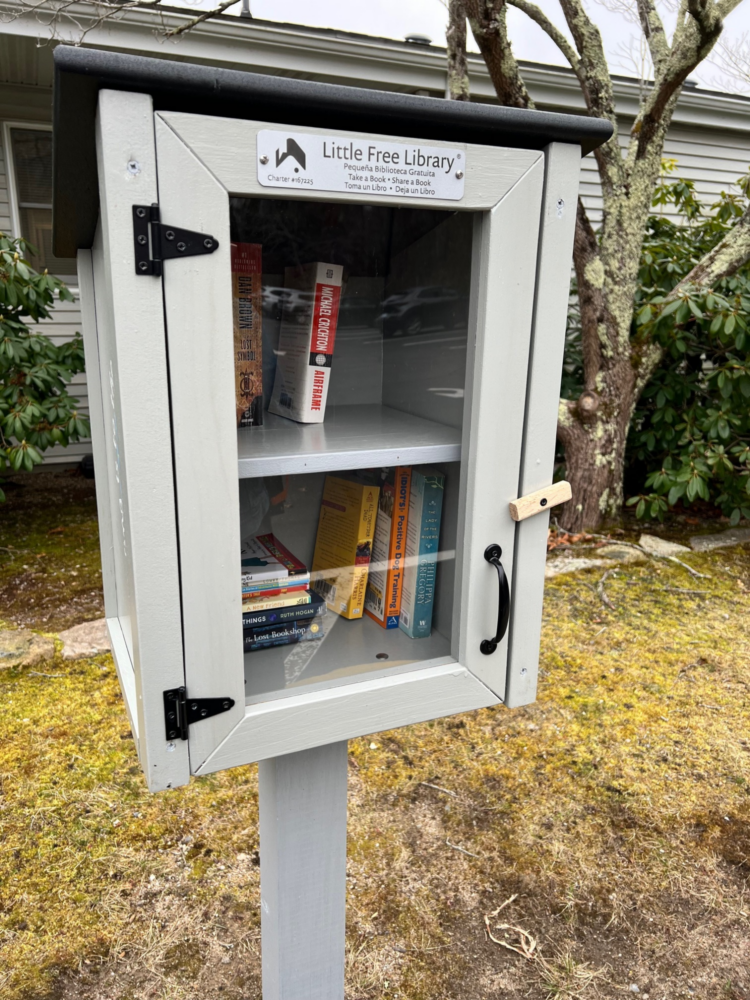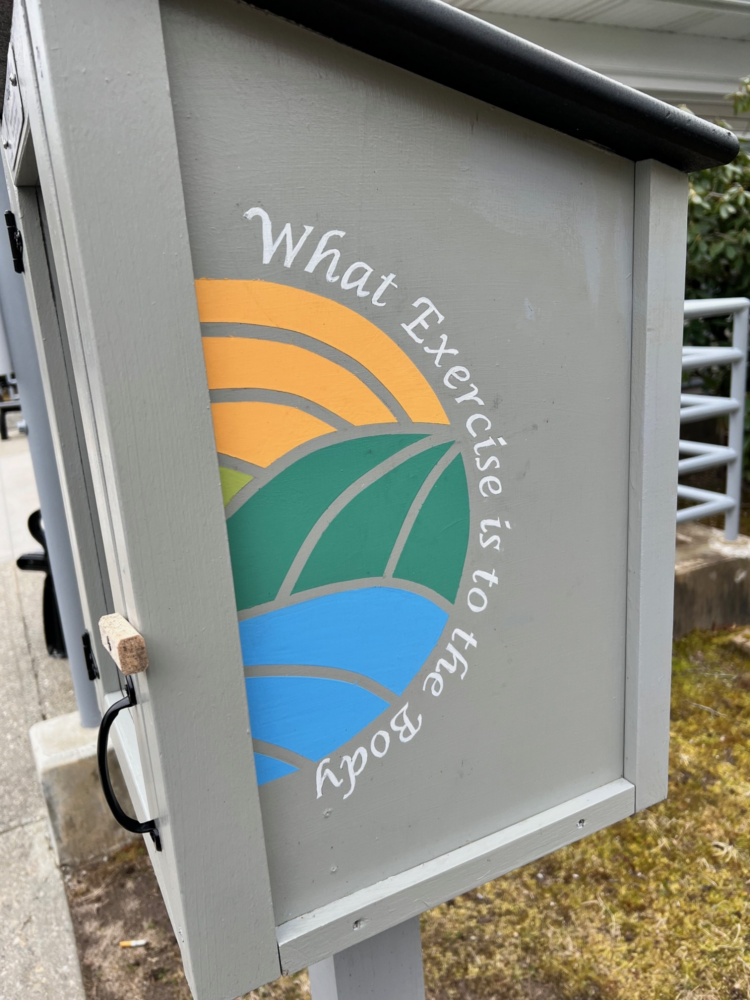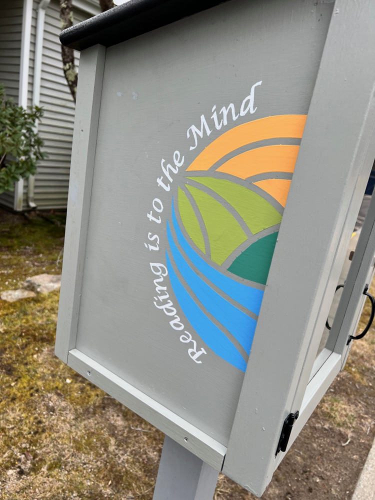 Director of Clinical Operations Jessica Joseph and Director of of Care Coordination Kat Miller served as the inspiration behind this project. President and CEO Alison Croke provided the resources to make it happen. Local artist Stephen Brunelli designed a pattern of Wood River Health's logo and painted each section. He also carefully hand lettered the text. Director of Development and Communications Sarah Channing created the design concept and developed the word phrasing. Jim Onorato of Stonington Builders & General Contractors, LLC ensured the library was firmly installed on our grounds.