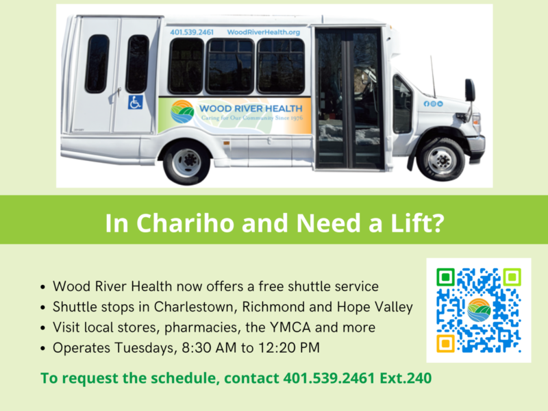 Wood River Health offers a shuttle service on Tuesdays with stops in Charlestown, Richmond and Hope Valley. Visit local stores, pharmacies, the YMCA and more! The shuttle currently runs 8:30 AM to 12:20 PM on Tuesdays. To request a schedule, please call 401.539.2461 Ext 240.